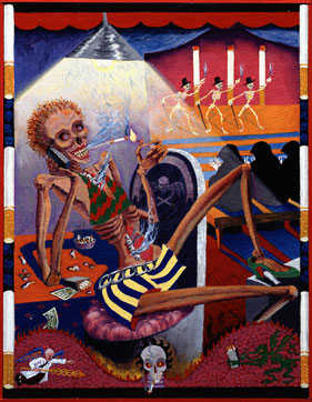 This match striking femme fatale first appeared in the 1920s as a voting smoking symbol of feminine freedom. In the 1960s, wearing mod hip huggers and a groovy halter top, slim-as-a-needle Señorita Cigarílla was a cadaverous super model chain smoking cigarettes made "just for her." Her message was dead simple: Thin is In and Smoking is Sexy. Giddy with her successful robbery of health and reason in the U.S. (your money AND your life!), Señorita Cigarílla has turned her addictive attentions abroad. Throughout Europe, Asia, Africa, and the Americas she is zealously spreading her message that smoking is glamourous. An experienced trendsetter, Señorita Cigarílla (minus one lung) continues to keep abreast of fashion.