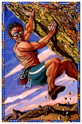 With heelhooks edging on a crux sequence, Radboy Rocks was mentally spraying pretty highly of himself as he pinkpointed over pebble farms way above the heads of the other dudes. The route had been thuggy, even crimpy, and despite new heelhooks, toehooks, smears, and ankle locks, Radboy wasn't sure he was going be able to wrap his sweaty paw around the near featureless prow poking into a sun-drenched sky. Automatically, he thrust his hand into the canvas bag at his side and rechalked. At least he looked 100 percent in his cool new gear and stylin' lycra threads. Just beneath a double-overhang slap he turned to give a thumbs-up to Bianca, his slinky, tanned, 5.11a-climbing French girlfriend. She appeared bugsize now, but he could imagine her focusing her zoom lens on him for the ultimate hero shot that would be splashed onto a mammoth poster at next month's Climbing Trade Show. Deftly doing an Iron Cross, Radboy felt a wave of something like nirvana sweep over him, like he'd just pulled off a Sandbag-Beta-flash, or done a solid bit of Buddhaing. It was one of those exquisite moments of oneness with the universe, and he knew that for the rest of this climb he'd just Zen it.